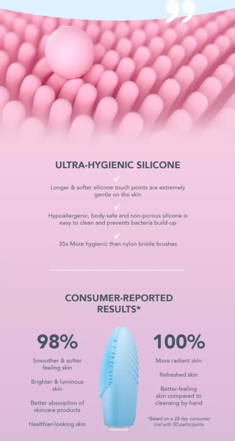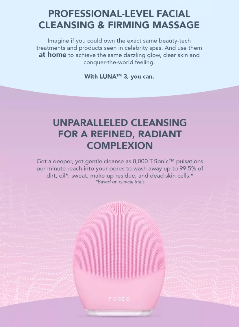 LUNA™ 3 is the ultimate addition to your cleansing ritual. Featuring upgraded T-Sonic™ pulsations at 16 different intensities, LUNA™ 3 blasts away dirt, oil and makeup residue in only one minute. With an improved design that offers longest and softest silicone touchpoints in the market - LUNA™ 3 is the best way to get the youthful glow you've always dreamed of.
